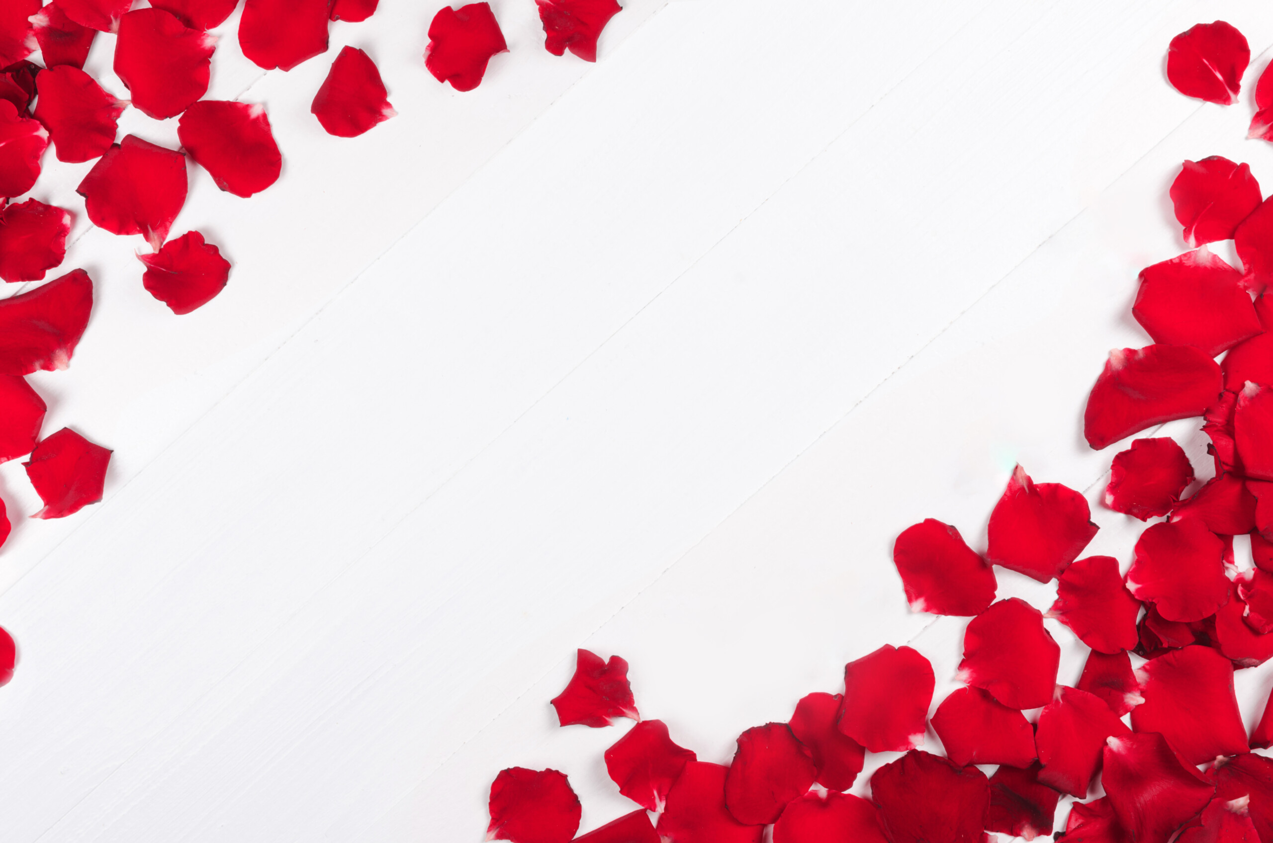 Rose petals on white wooden background
